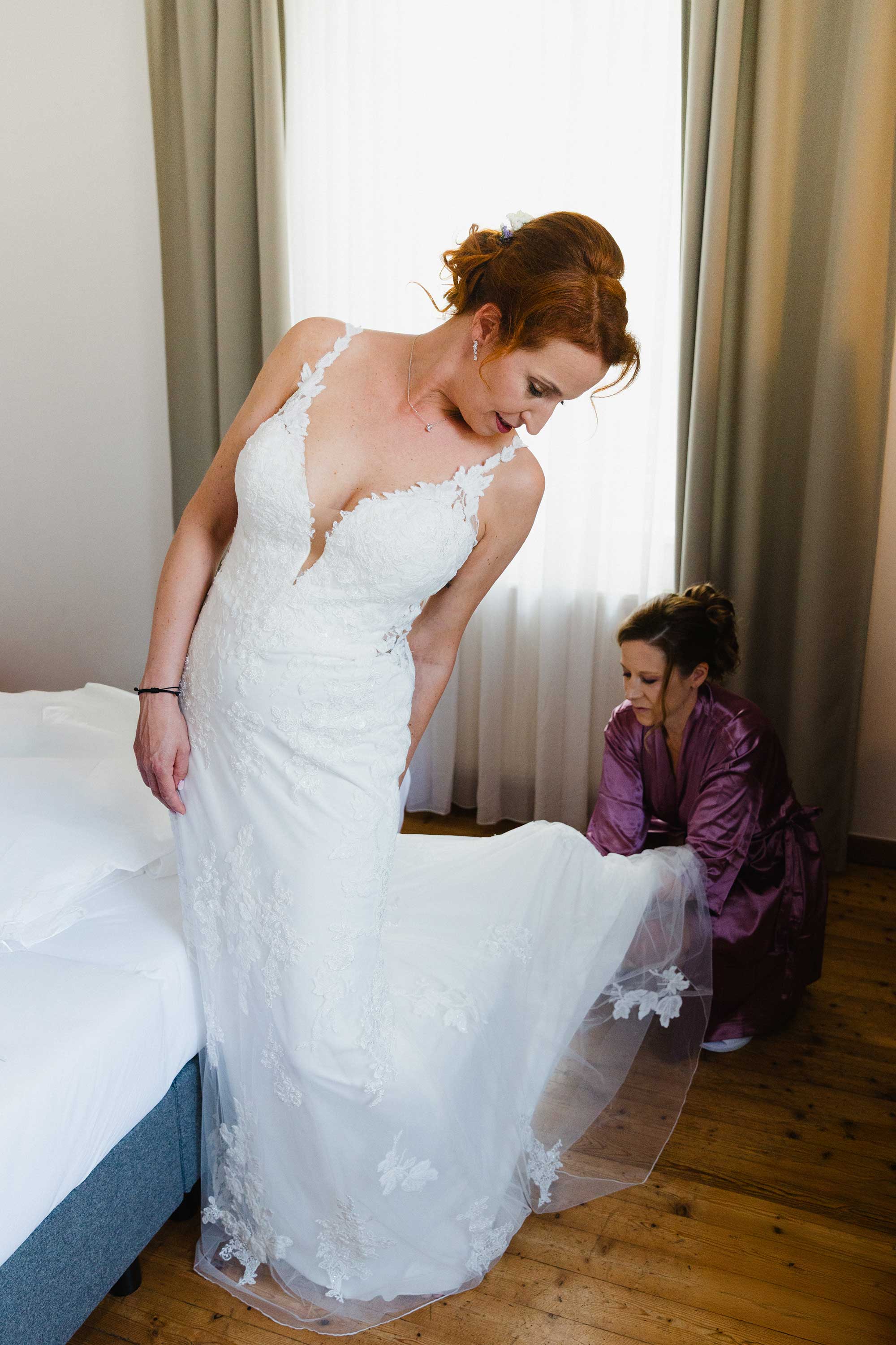 Hier entstehen die ersten echten Hochzeitsmomente: nicht nur das Styling, sondern die kleinen, liebevollen Gesten, die diesen Moment so besonders machen.