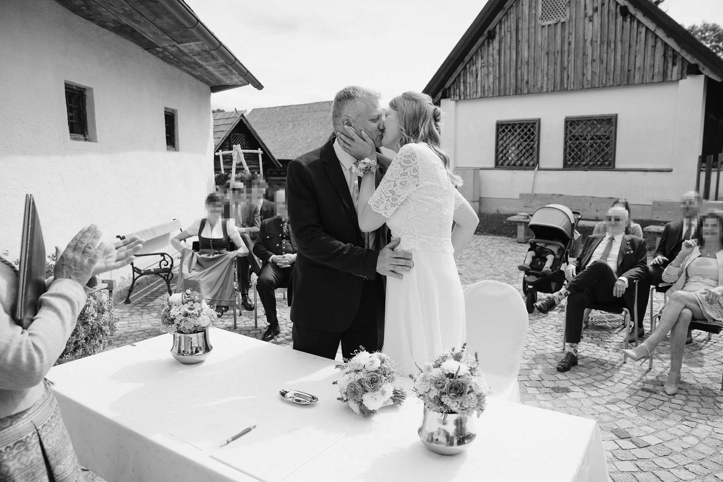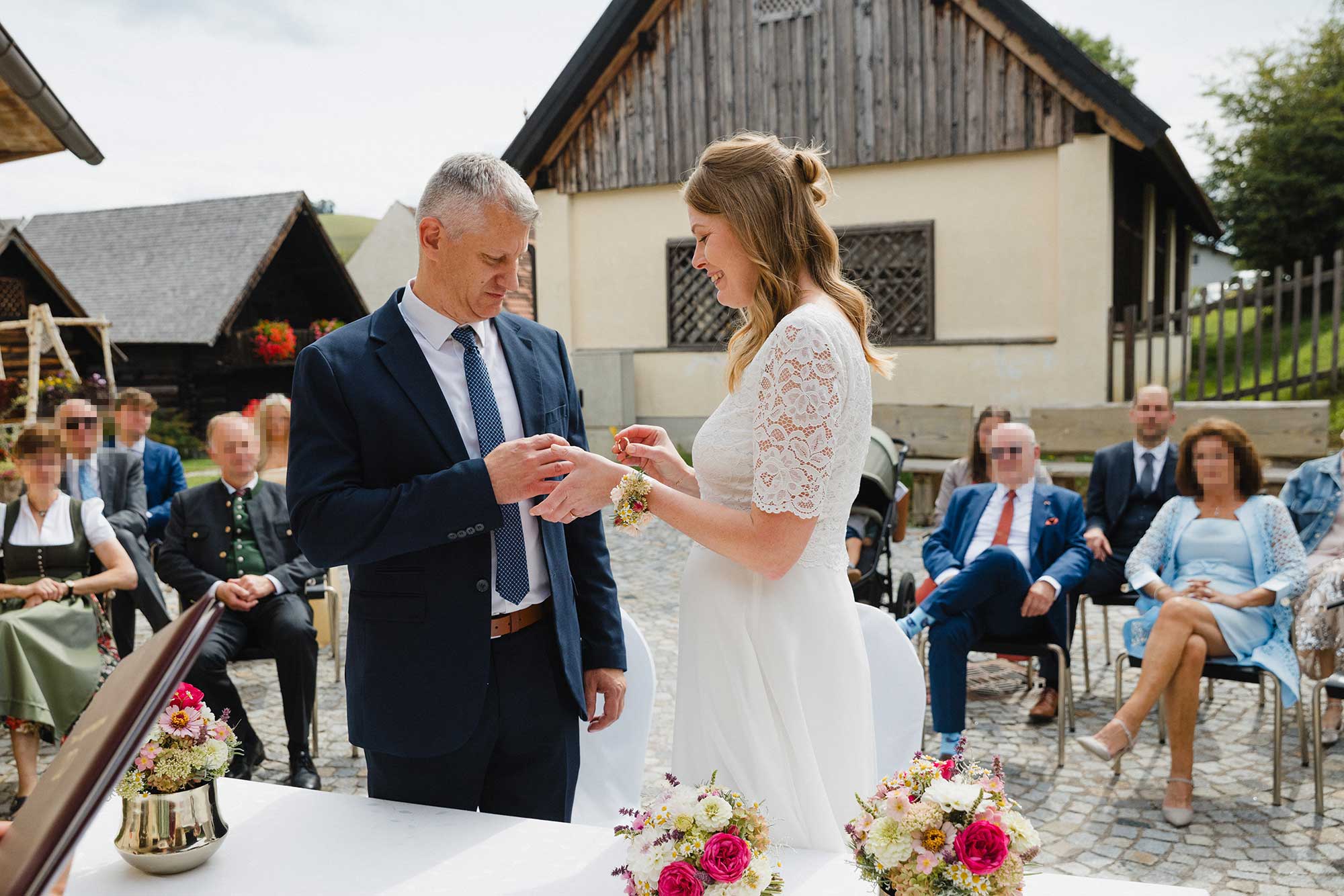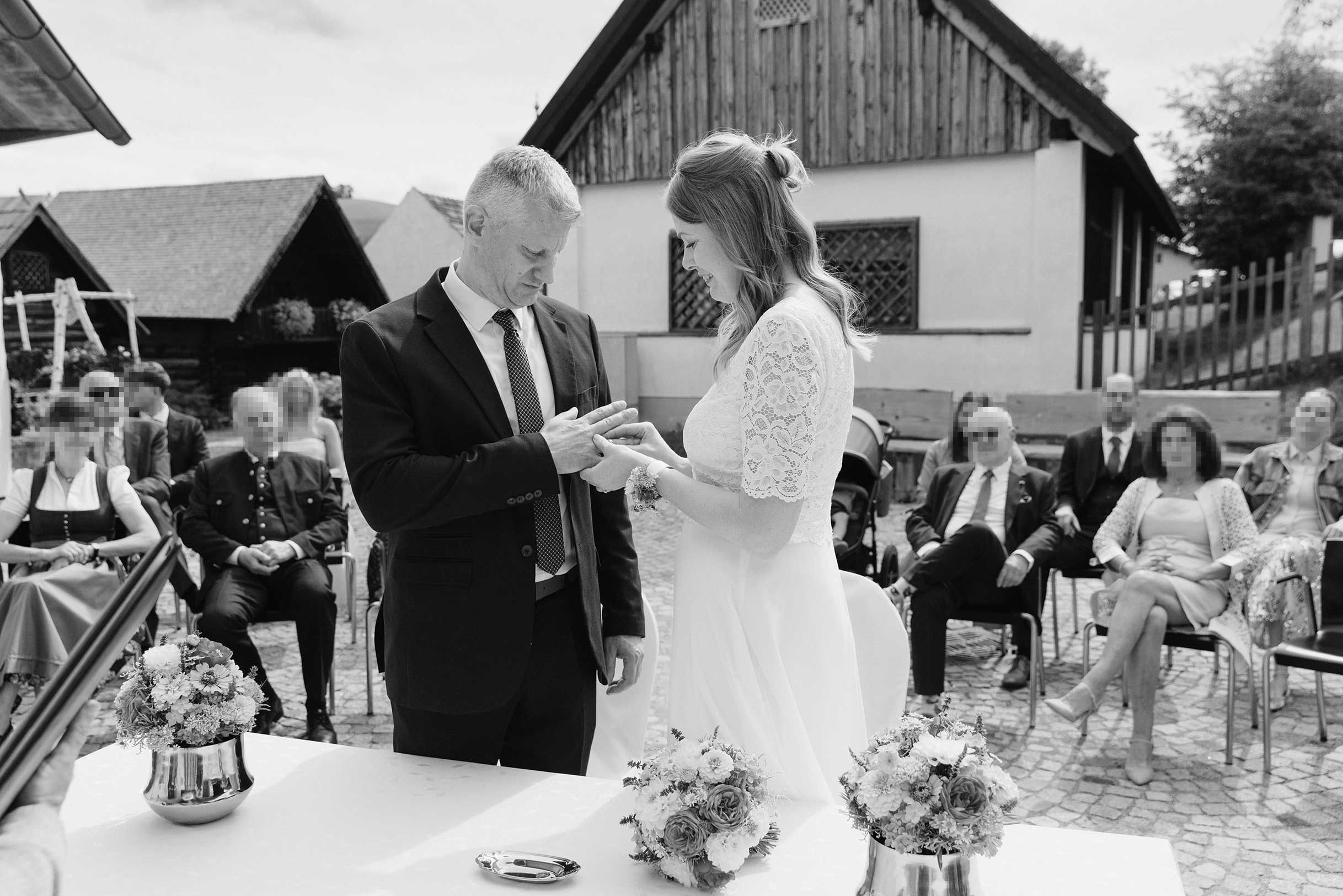 Outdoor, in der stimmungsvollen Kulisse des Museumsdorfs Krumbach, fand die Trauung statt – ein stiller, sehr persönlicher Moment, der gerade durch seine Schlichtheit berührte.