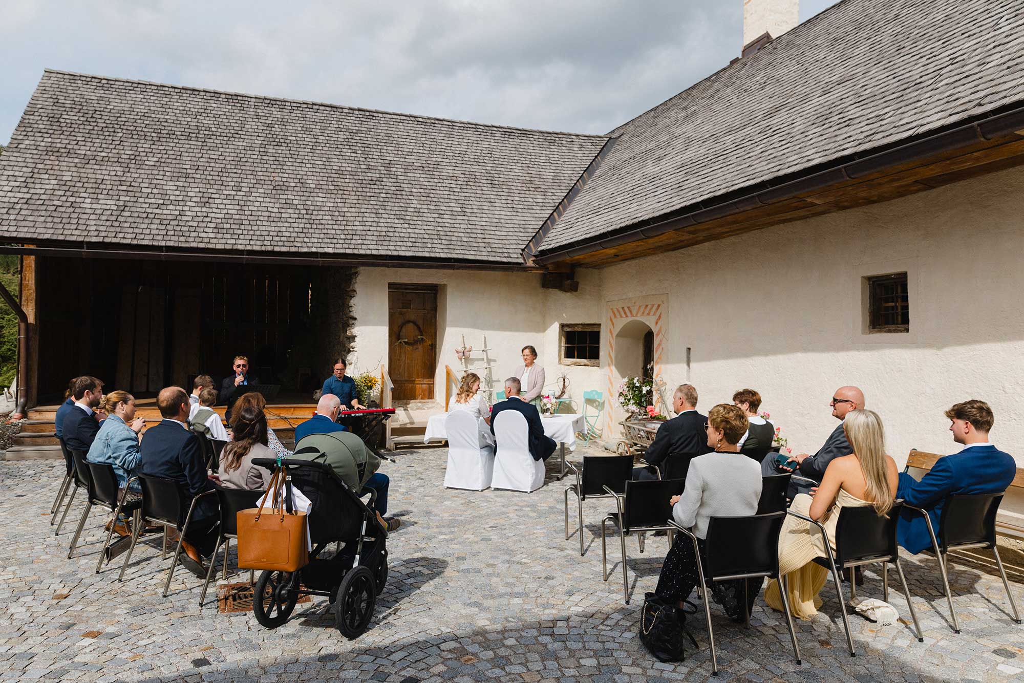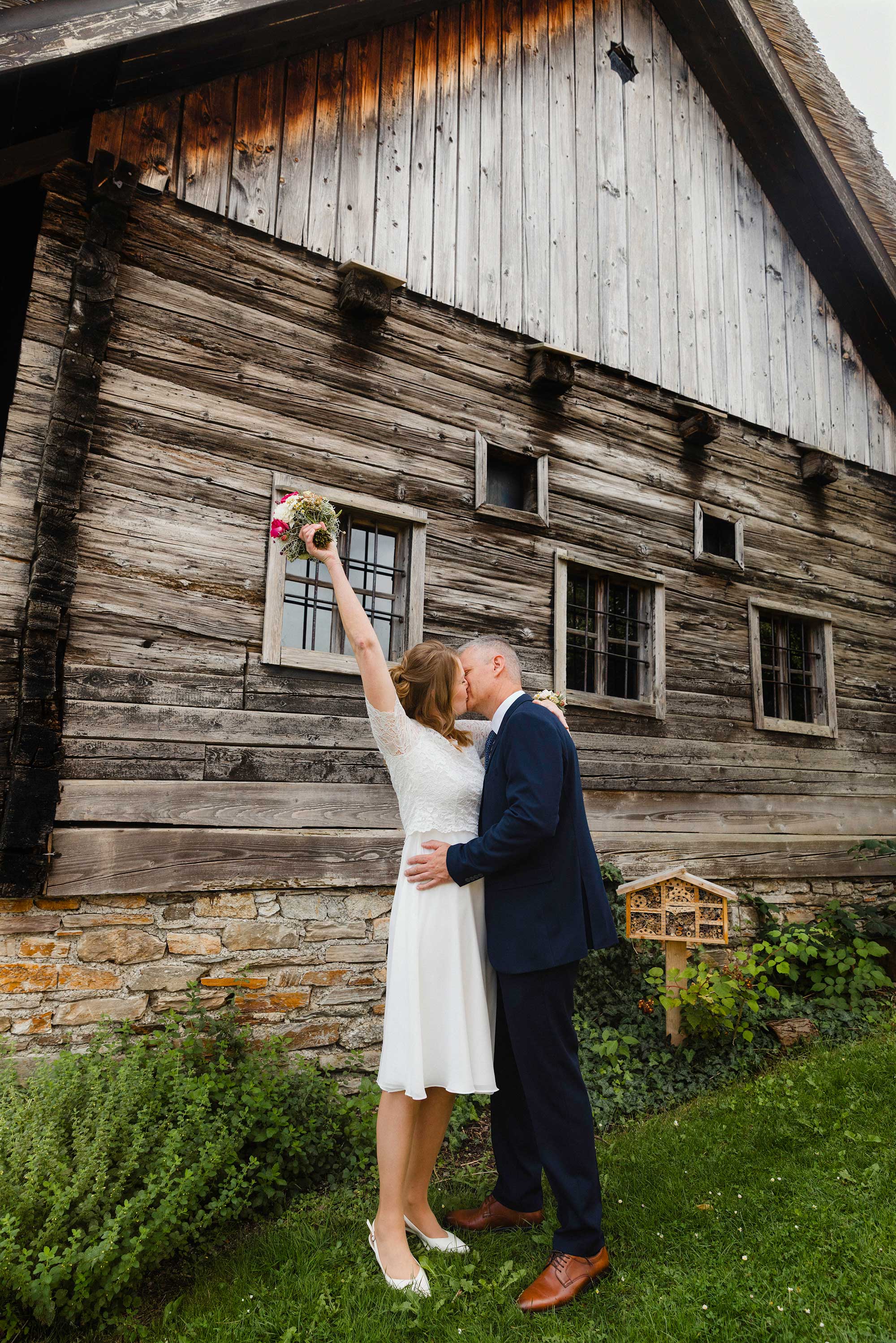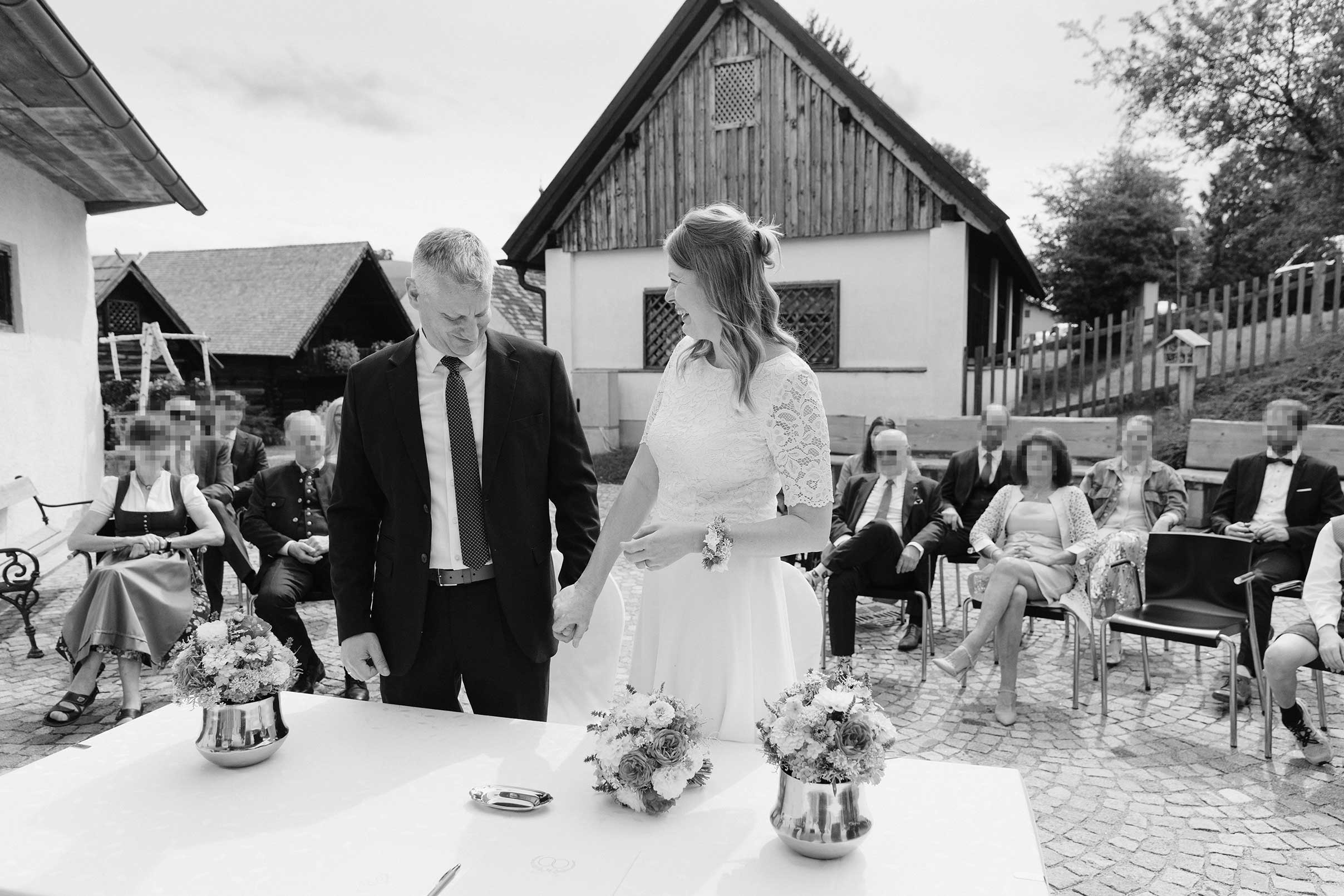Outdoor, in der stimmungsvollen Kulisse des Museumsdorfs Krumbach, fand die Trauung statt – ein stiller, sehr persönlicher Moment, der gerade durch seine Schlichtheit berührte.