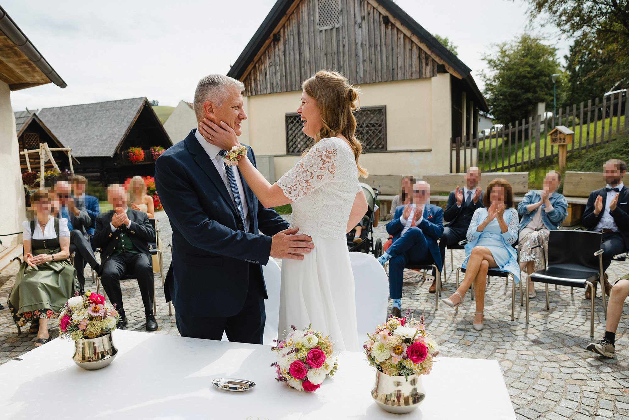 Nach der Zeremonie folgten die Gratulationen, ein paar Gruppenfotos und ein ganz kurzes Brautpaarshooting. Keine Hektik, kein umfangreiches Programm – nur das Wesentliche. Zeit für echte Emotionen und ehrliche Bilder.