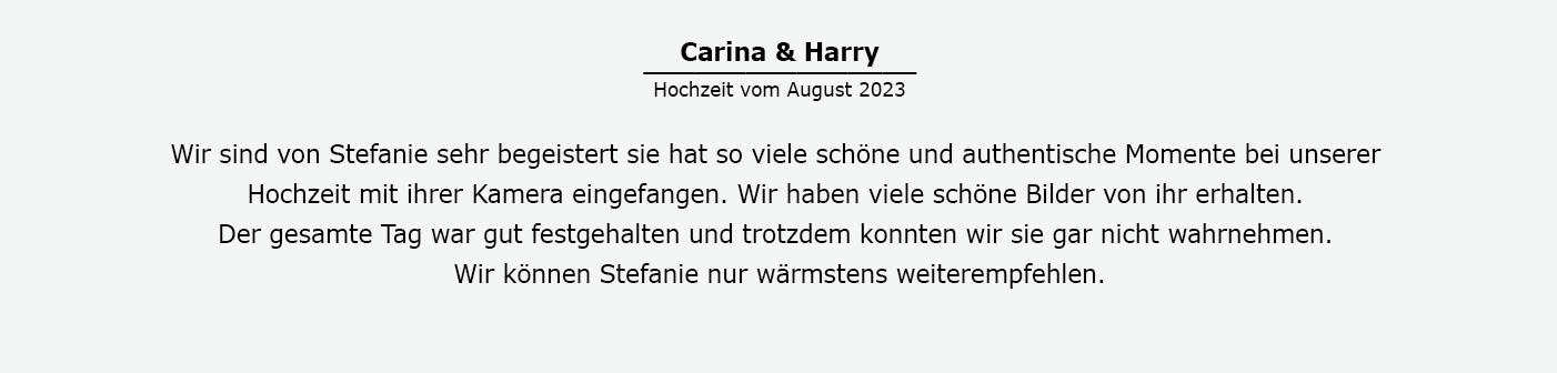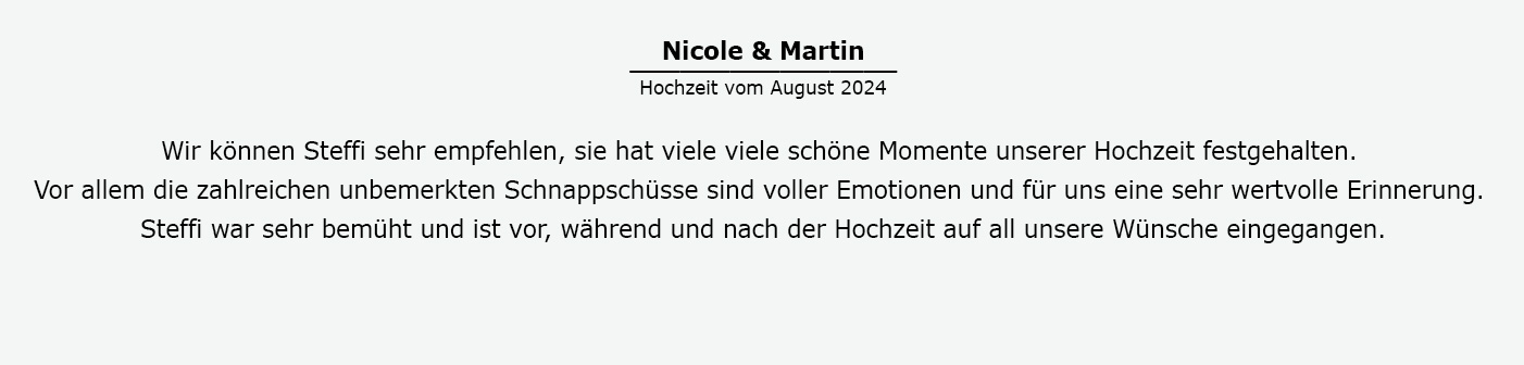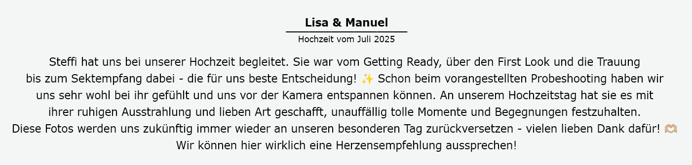 Vom Getting Ready bis zu eurer Hochzeitsfeier am Abend - gerne bin ich während des ganzen Tages an eurer Seite, um all die wichtigen Momente für euch festzuhalten. Aber auch für kurze Reportagen könnt ihr mich natürlich gerne buchen. Für wie viele Stunden ihr mich braucht, bzw. welche Programmpunkte ich für euch festhalten soll, können wir gerne bei einem persönlichen Gespräch besprechen. Gemeinsam finden wir heraus, was für euch und eure Hochzeit sinnvoll ist.
