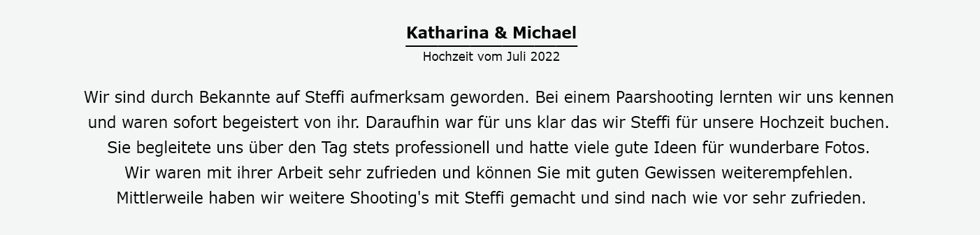 Seit 2016 bin ich nun bereits als Hochzeitsfotografin in der Buckligen Welt und Umgebung unterwegs. In dieser Zeit durfte ich schon viele wunderbare Hochzeiten begleiten und viele wertvolle und emotionale Momente für meine Brautpaare einfangen. Mir sind besonders die echten, ungestellten Momente am Hochzeitstag wichtig. Im Idealfall die, in denen ihr und eure Gäste mich nicht bemerkt. Ich liebe es, all die Freude, das Lachen, ... einfach diese besondere Stimmung dieses speziellen Tages festzuhalten. Momente widerzuspiegeln, die ihr in dem Moment vielleicht gar nicht so wahrgenommen habt und die erst durch das Foto zu einer besonderen Erinnerung werden.❤